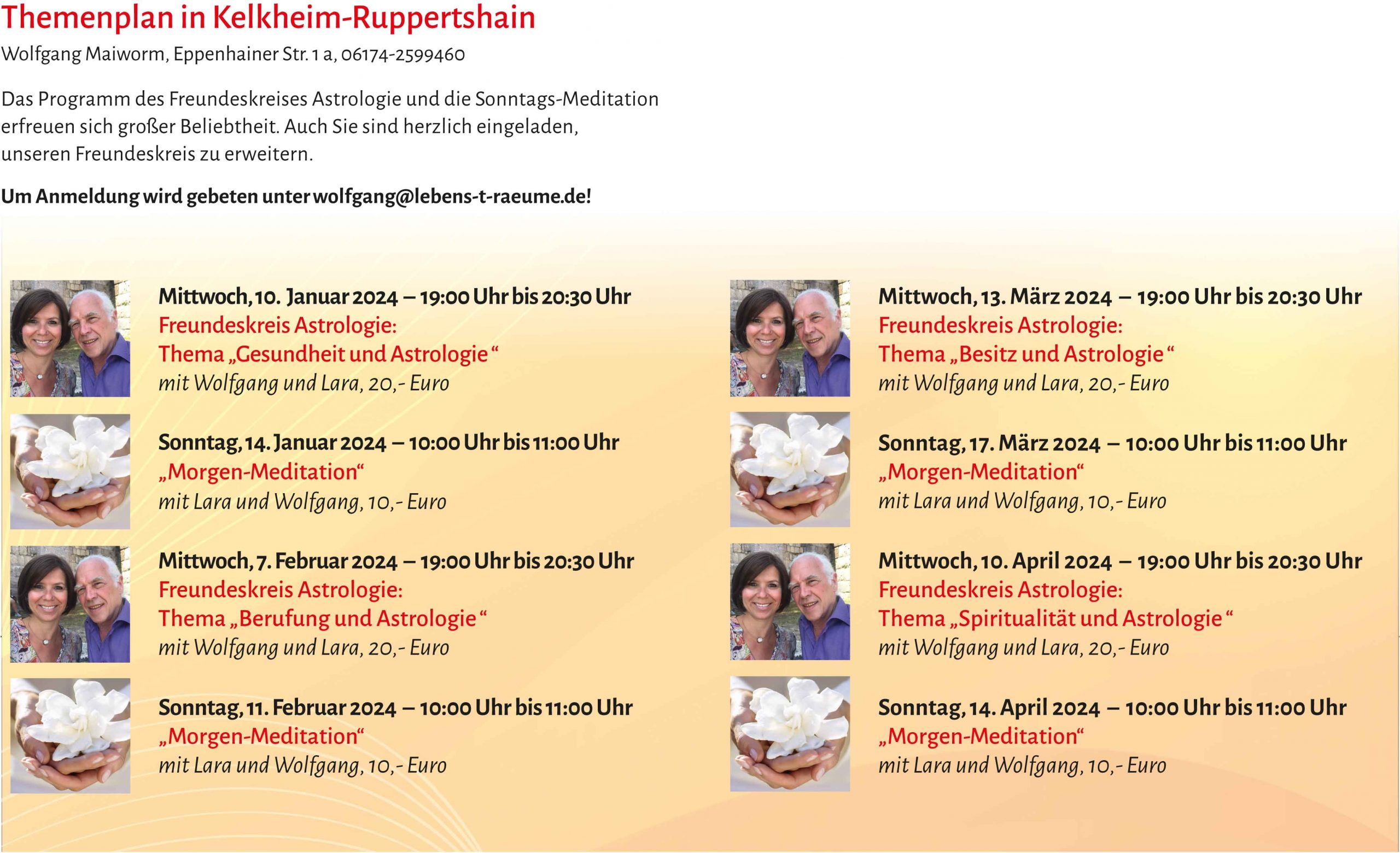 Selbsterkenntnis ist für uns der „Sinn des Lebens“. Um den roten Faden des eigenen Lebens zu erkennen und aufzunehmen, bieten wir unsere beliebte „Astrologische Lebensplan-Besprechung“ in Kelkheim Ruppertshain an. Profitieren Sie von der 40 jährigen, astrologischen Erfahrung von Wolfgang und buchen Sie Ihren Termin telefonisch oder online auf dieser Internetseite. Termin hier